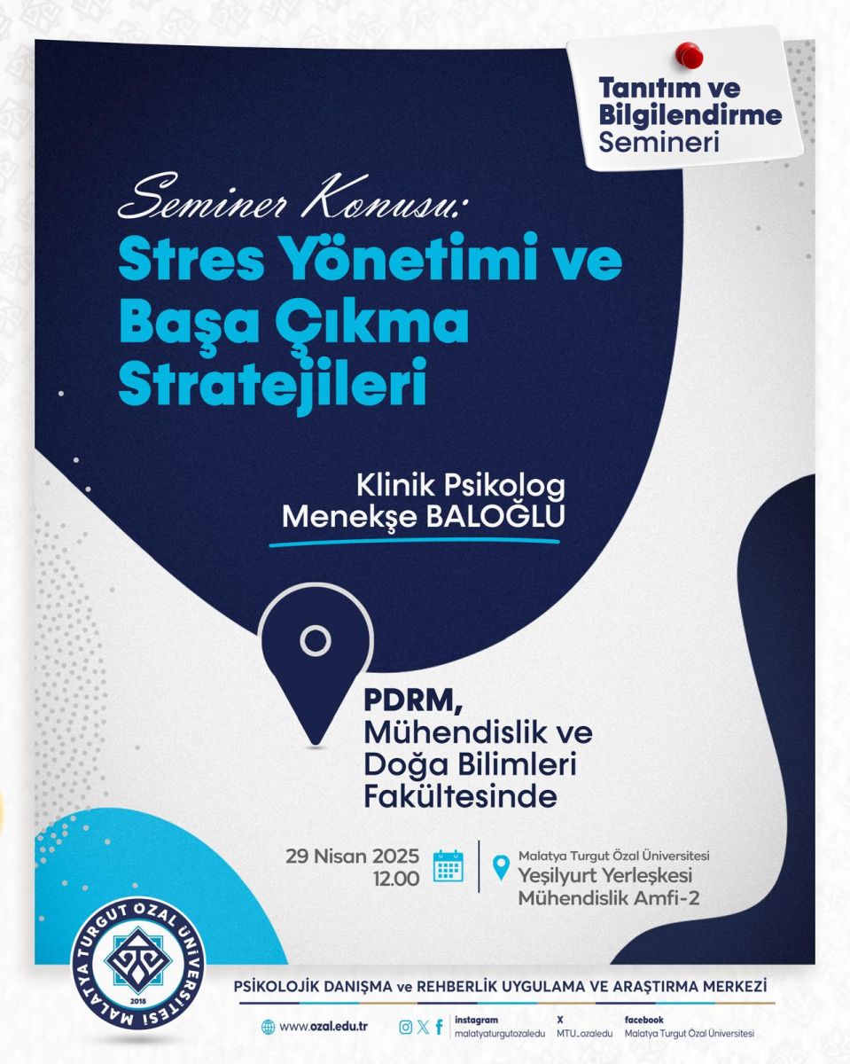 Stres Yönetimi ve Başa Çıkma Stratejileri Updated Date: 28-04-2025 19:01 | Start Date: 29-04-2025 12:00 | End Date: 29-04-2025 17:00 | YER: Malatya Turgut Özal Üniversitesi