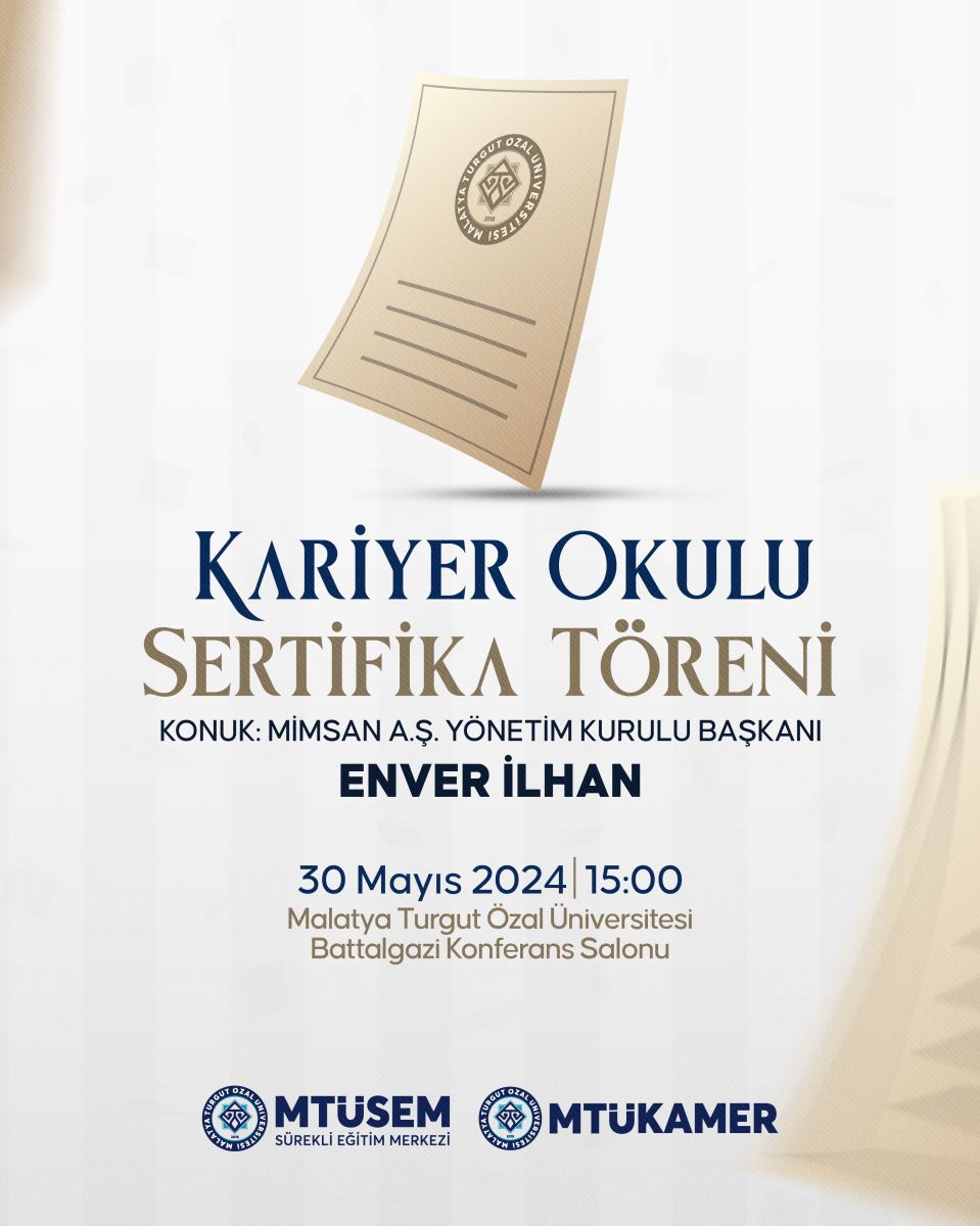 Kariyer Okulu Sertifika Töreni Güncellendiği Tarih: 27-05-2024 12:24 | Başlangıç Tarihi: 30-05-2024 12:23 | Bitiş Tarihi: 31-05-2024 12:23 | YER: Malatya Turgut Özal Üniversitesi