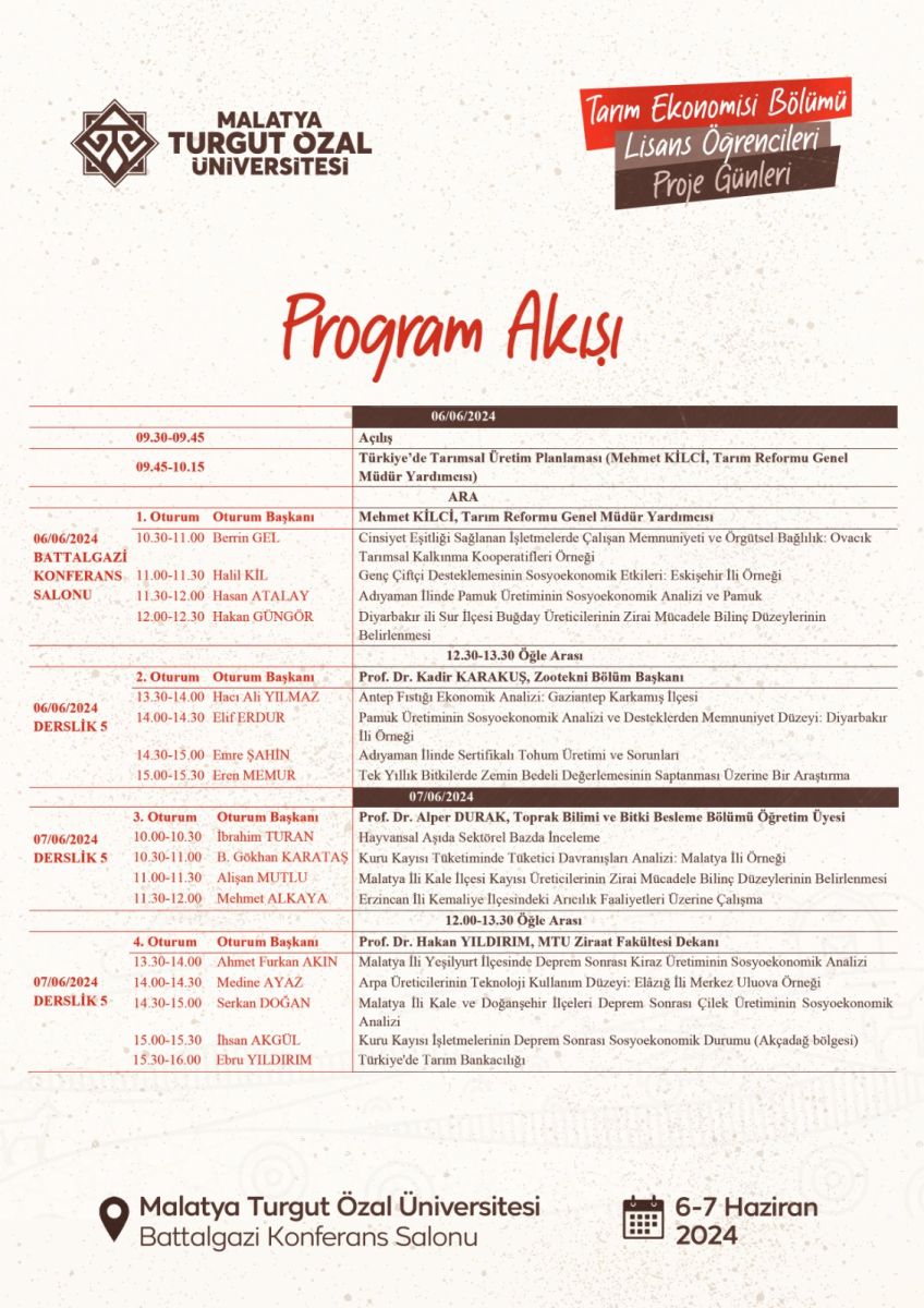 Tarım Ekonomisi Bölümü Lisans Öğrencileri Proje Günleri Güncellendiği Tarih: 04-06-2024 10:46 | Başlangıç Tarihi: 06-06-2024 09:30 | Bitiş Tarihi: 06-06-2024 17:00 | YER: Malatya Turgut Özal Üniversitesi