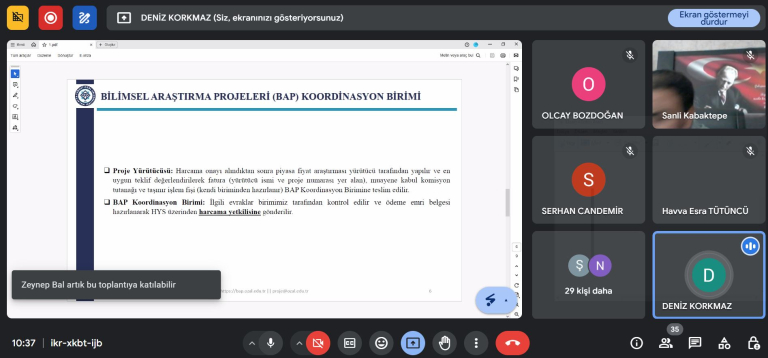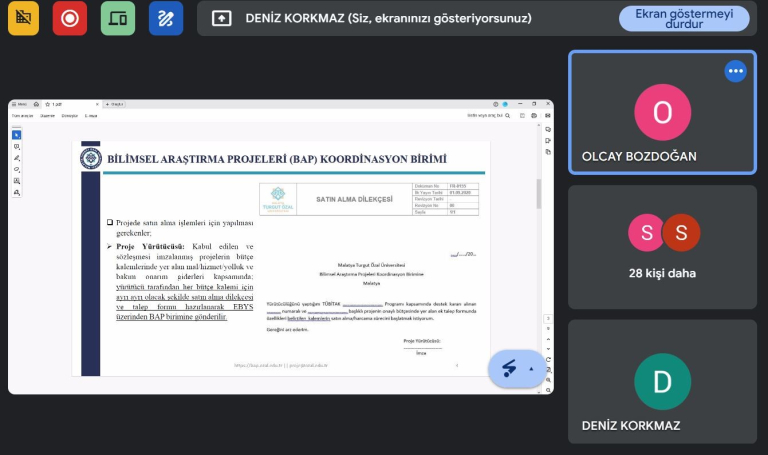 12 Temmuz 2024 tarihinde Malatya Turgut Özal Üniversitesi Bilimsel Araştırma Projeleri (BAP) Koordinasyon Birimi tarafından TÜBİTAK – ARDEB Ulusal Destek Programları kapsamında yürütülen projelerde gerçekleştirilen harcama ve ödeme süreçlerine ilişkin çevrimiçi (online) bilgilendirme eğitimi gerçekleştirildi. Geçmiş dönemlerde projeleri kabul edilerek yürütülmeye devam eden ve 2024 yılı içerisinde bilimsel değerlendirme sonucu başarılı bulunarak desteklenmeye hak kazanan 20’den fazla TÜBİTAK projesinde görevli Yürütücü, Araştırmacı ve Danışmanların katıldığı eğitimde Harcama Yönetim Sistemi’nin (HYS) kullanımı, projeler kapsamında yapılan satın alma süreçleri, burs ödemleri, yurtiçi/yurtdışı seyahat görevlerinde ödemeler ve muayene ve kabul süreçlerinde yapılan işlemlere ilişkin detaylı bilgilendirmeler yapıldı.