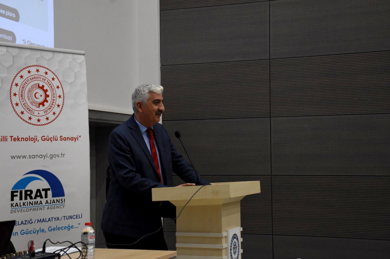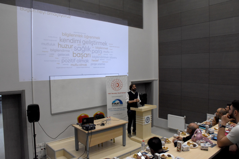 Fırat Kalkınma Ajansı’ndan Dr. Ahmet Yıldıray Ata tarafından verilen eğitimde; bir fikrin nasıl projeye dönüştürüleceği ve "Sorundan Çözüme Doğru" ilerleme süreci, projeye mantıksal çerçevede yaklaşımı gibi teknik detaylar interaktif bir sunumla paylaşıldı.