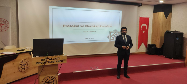 Bilgi toplumunda kurumlar artık çalışanlarında çok yönlü ve ustalaşmış beceri sahibi olma, karmaşık kurum içi ve kurum dışı ilişkileri kavrayabilme yeterliliği ve etkili ekip çalışmasına uyum yeteneği gibi özellikler aramaktadır. Bu bağlamda Battalgazi Devlet Hastanesinde çalışan personele sağlıklı iletişim ile protokol ve nezaket kuralları konularında 2 gün sürecek olan bir eğitim verilecektir. Bu programın düzlenmesine vesile olan ve emeği geçen Battalgazi Devlet Hastanesi yönetimi ve çalışanlarına şükranlarımı sunarım.”dedi. Sağlıklı İletişim konusunda Dr. Öğr. Üyesi Abuzer YEŞİL, personelin hasta ile sağlıklı iletişim kurmalarını engelleyen nedenleri ortadan kaldırmak için dikkat edilmesi gereken hususlar, hasta ve hasta yakını ile doğru iletişim kurmanın önemli noktaları, öfke yaşayan hasta ve yakınlarıyla iletişim kurarken dikkat edilmesi gereken hususlar hakkında bilgiler verdi. Protokol ve Nezaket Kuralları konusunda Öğr. Gör. Cumali AYDOĞAN, protokolün anlam ve önemi, kamuda saygı ve nezaket kuralları, selamlama, konuşma ve makam protokolü konularında bilgiler verdi. Programın sonunda eğitim veren hocalara plaket takdim edilerek eğitime katılan personele de katılım belgesi verilmiştir.