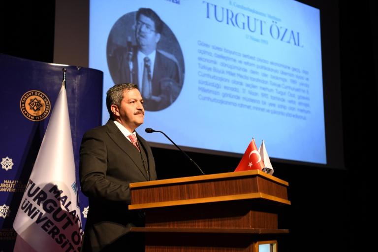 Malatya Turgut Özal Üniversitesi, ismini taşıdığı Türkiye Cumhuriyeti’nin 8. Cumhurbaşkanı Turgut Özal’ı, vefatının 32. yıl dönümünde anlamlı bir etkinlikle andı. 17 Nisan 2025 tarihinde Malatya Turgut Özal Üniversitesi Battalgazi Konferans Salonu’nda düzenlenen “Türkiye’nin Siyasi ve İktisadi Dönüşümünde Özal” başlıklı konferansa Malatya Valisi Seddar Yavuz, Malatya Milletvekili ve Eski Gümrük ve Ticaret Bakanı Av. Bülent Tüfenkci, Malatya Büyükşehir Belediyesi Başkan Vekili Ramazan Ayhan, Rektör Prof. Dr. Recep Bentli, İnönü Üniversitesi Rektörü Prof. Dr. Nusret Akpolat, Fırat Üniversitesi Rektörü Prof. Dr. Fahrettin Göktaş, İl Jandarma Komutanı J. Kd. Alb. Tolunay Başer, AK Parti Malatya İl Başkanı Ali Bakan çeşitli kamu kurum ve kuruluşlarının yöneticileri, basın mensupları, akademisyenler, öğrenciler ve çok sayıda davetli katıldı. Program, saygı duruşu ve İstiklal Marşı’nın ardından merhum Turgut Özal’ın hayatını konu alan sinevizyon gösterimiyle başladı. Ardından merhum cumhurbaşkanının biyografisi katılımcılarla paylaşıldı.