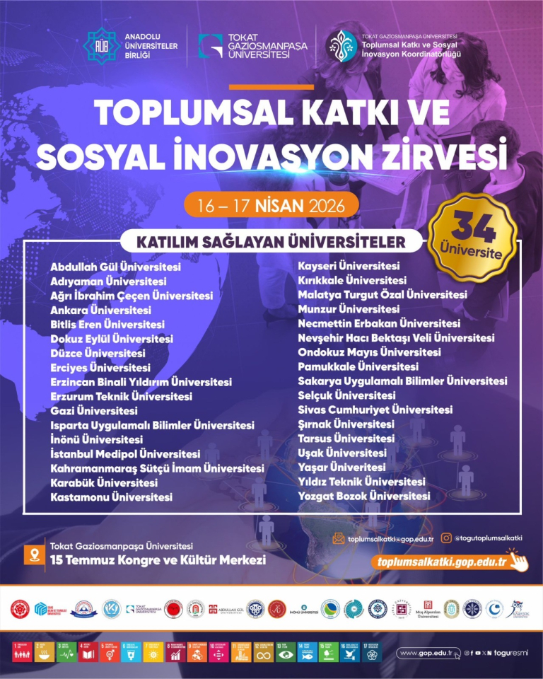 Tokat Gaziosmanpaşa Üniversitesi ev sahipliğinde 16–17 Nisan 2026 tarihlerinde gerçekleştirilen Toplumsal Katkı ve Sosyal İnovasyon Zirvesi’nde Malatya Turgut Özal Üniversitesi, Toplum ve Sanayi İş Birliği Koordinatörlüğü tarafından temsil edilmiştir.